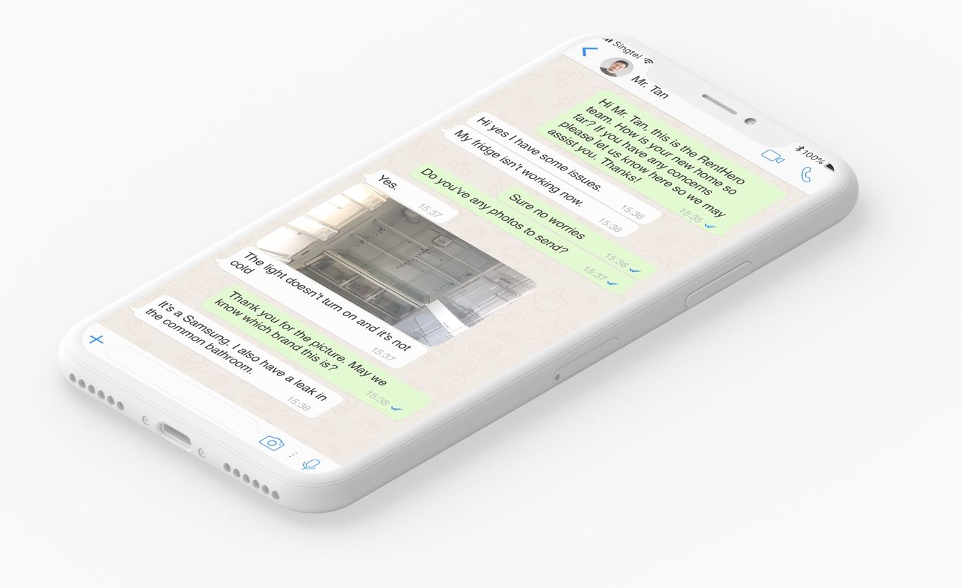 Instead of contacting the agent or landlord, the tenant reaches out to RentHero’s support staff via instant messaging to describe their issues and send photos. RentHero’s support staff are available 7 days a week so Mr. Tan can get a response even on the weekend.